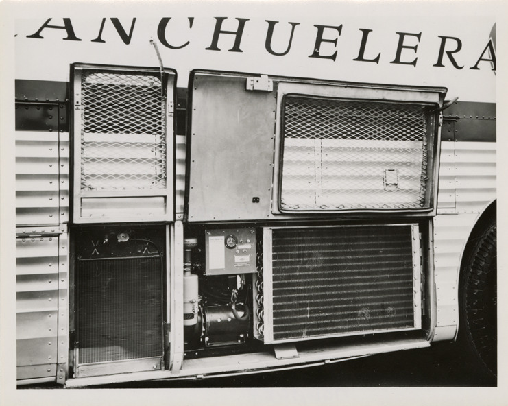 View of the engine for a 1955 Beck "Semicruiser" bus, Compania de Transporte Omnibus la Ranchuelera, S.A. Handwritten on back: "Beck 'Semicruiser' DH-1040 series, 1955. Cuba."