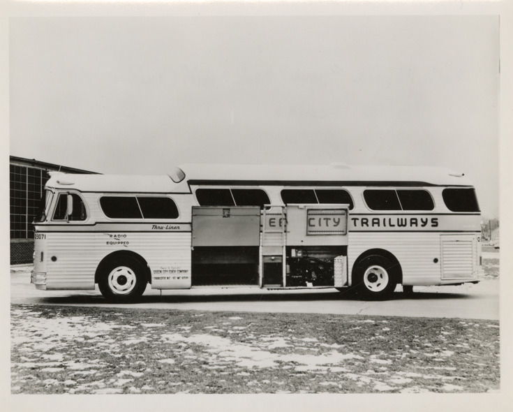 Favorite this☆ 1955 Beck bus, Queen City Trailways Description: View of a 1955 Beck bus for Queen City Trailways, showing open baggage compartment. Handwritten on back: "Beck 41 pass. 'Semi' Deck & Half cruiser. 9600 series, 1955." Details Resource ID: na047907 Subject: Buses C.D. Beck & Company Trailways Transportation System Photographic prints Date Issued: Unknown year Format: 1 photographic print ; 4 x 5 in. Member of: National Automotive History Collection Filing Location: MS121/VanDegrift, Thomas, 5:10 Rights: Physical rights are retained by DPL. Copyright is retained in accordance with U.S. copyright laws.