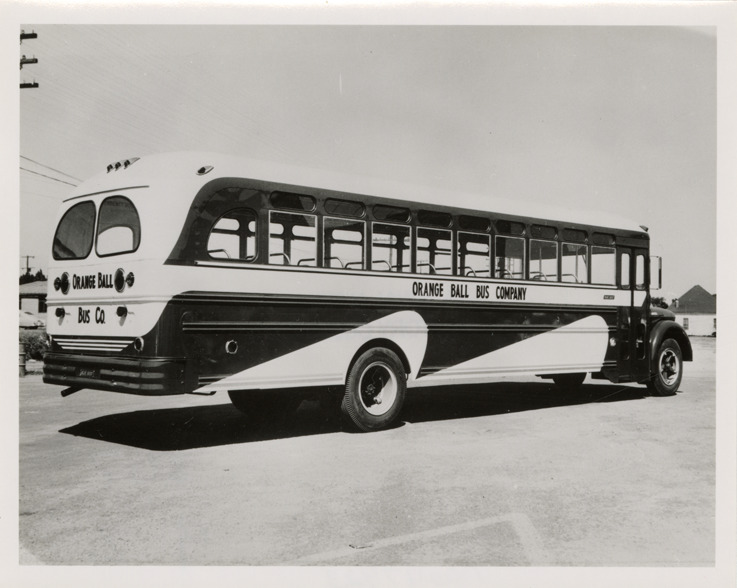 View of a Blue Bird bus for the Orange Ball Bus Company. Handwritten on back: "Blue Bird."