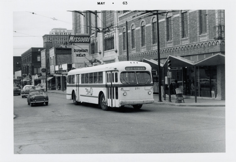 View of an ACF-Brill trolley bus for the St. Joseph Light and Power Company in St. Joseph, Missouri. Stamped on front: "May 1963." Handwritten on back: "Brill. St. Joseph Light & Power Co., St. Joseph, Mo. March 1962. Have similar colored slide."