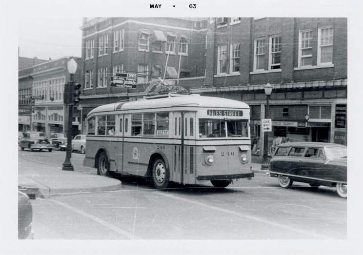 View of an ACF-Brill trolley bus for the St. Joseph Light and Power Company in St. Joseph, Missouri. Printed on front: "May 63." Handwritten on back: "Brill. St. Joseph Light & Power Co., St. Joseph, Mo. March 1953."