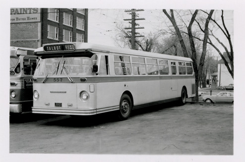 View of a Canadian Car and Foundry bus for Greater Winnipeg Transit. Handwritten on back: "Canadian Car. Greater Winnipeg Transit, Winnipeg, Man. Oct. 1960. 25 in service, 12-60. Canadian Car & Foundry."