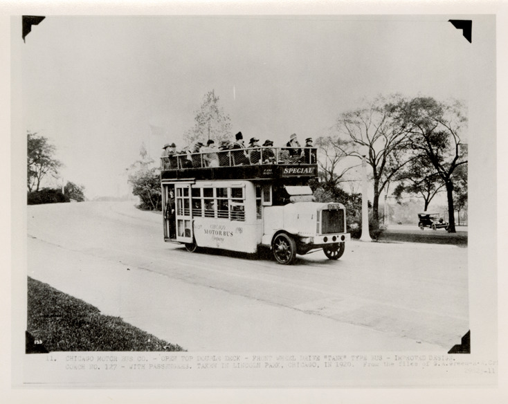 View of passengers riding on a Chicago Motor Bus Company double-decker bus. Typed on front: "11. Chicago Motor Bus Co. Open top double deck. Front wheel drive 'Tank' type bus. Improved design. Coach no. 127 with passengers. Taken in Lincoln Park, Chicago in 1920. From the files of G.A. Green, R.A. Crist." Handwritten on back: "Chicago Motor Bus Co. Tank type 1920."