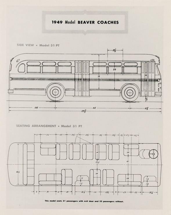 Side view and seating arrangement drawings of a 1949 Beaver bus. Printed on front: "1949 model Beaver coaches. Side view, model 31 PT."