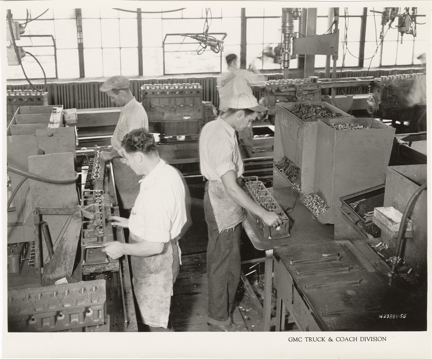 Workers assembling cylinder heads, GMC Truck & Coach Division factory