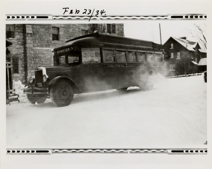 View of a Colonial Coach Lines bus. Handwritten on front: "Feb 23/34." Handwritten on back: "Colonial Coach Lines, Ottawa, Ont."