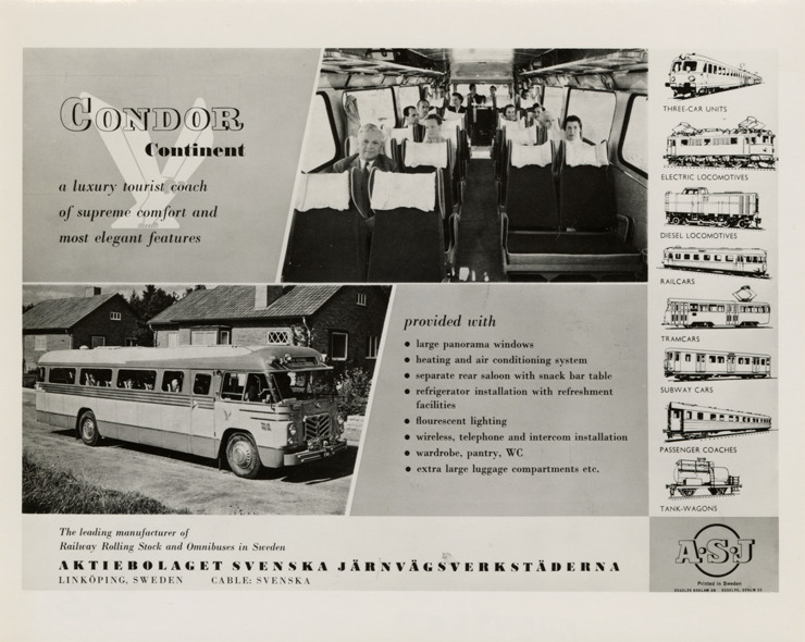 Advertisement for a Condor bus, showing exterior and interior views. Printed on front [in part]: Condor Continent, a luxury tourist coach of supreme comfort and most elegant features. The leading manufacturer of railway rolling stock and omnibuses in Sweden, Aktiebolaget Svenska Jarnvagsverkstaderna, Linkoping, Sweden."
