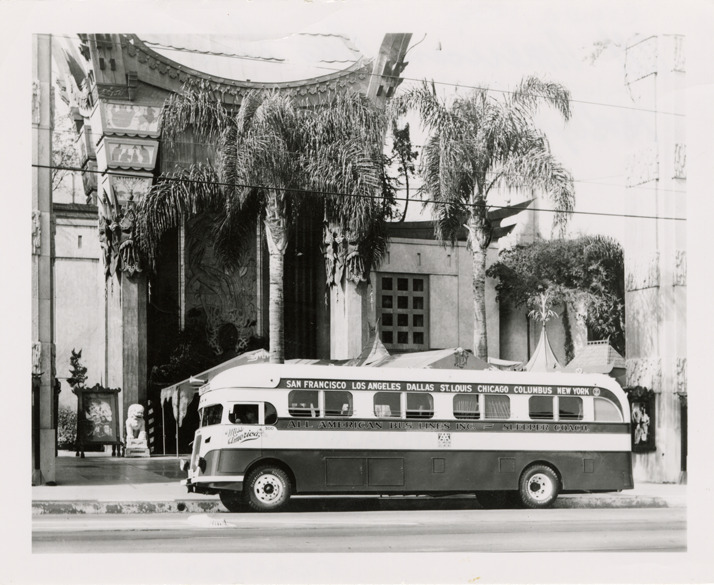 View of a 1936 Crown bus for All American Bus Lines at Grauman's Chinese Theatre in Los Angeles, California. Handwritten on back: "Crown, 1936. All American Bus Lines #300. Sleeper coach. Hollywood, California."