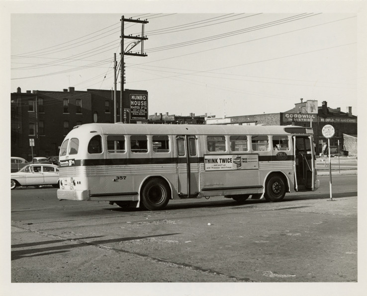 View of a 1950 Fageol Twin Coach bus for the SW&A Railway. Stamped on back: "Oct. 1961." Handwritten on back: "Fageol Twin Coach. Model 38S, blt. 1950. SW&A Railway, Windsor, Ont."