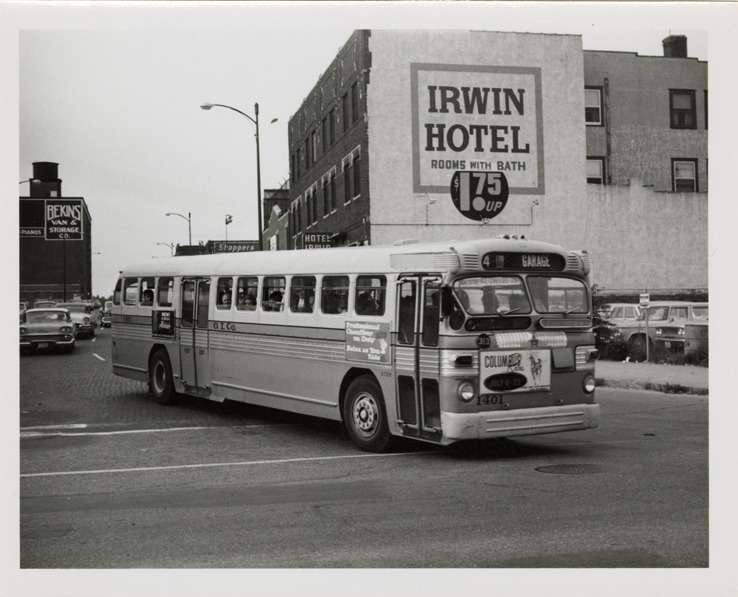 View of a Fageol Twin Coach bus. Irwin Hotel in background. Stamped on back: "Jul 1963." Handwritten on back: "Fageol Twin Coach."