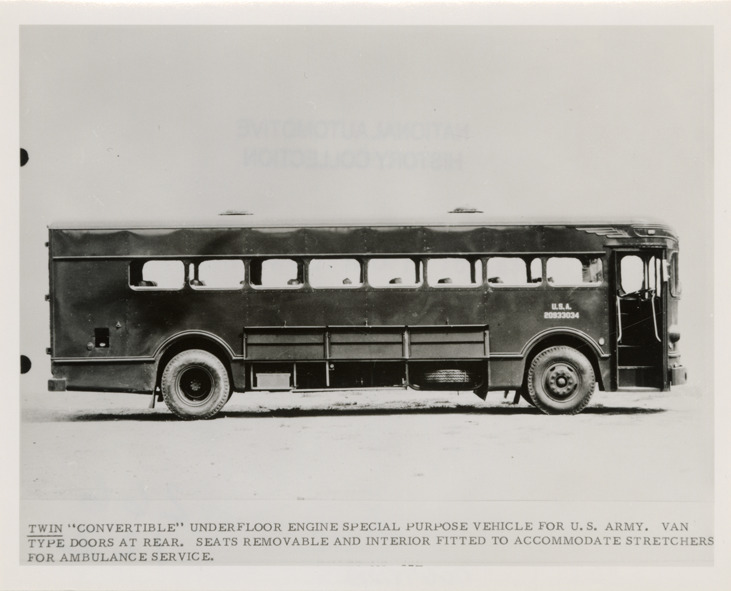 View of a Fageol Twin Coach bus for the United States Army. Printed on front: "Twin convertible underfloor engine special purpose vehicle for U.S. Army. Van type doors at rear. Seats removable and interior fitted to accommodate stretchers for ambulance service." Handwritten on back: "Fageol Twin Coach."