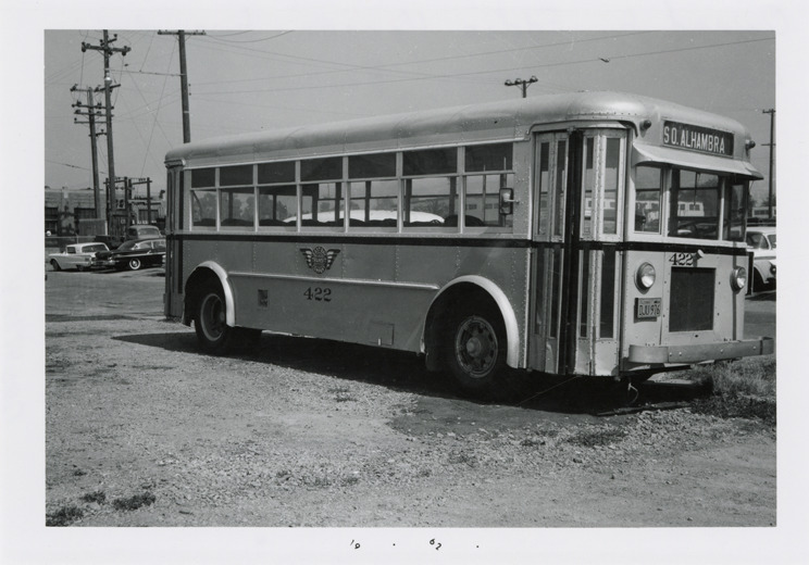 View of a Fageol Twin Coach bus for East Shore Lines in Berkeley, California. Stamped on back: "Andrew R. Harrison, motor coaches and motor coach transportation. 10917 Choisser St., Whittier, Calif. Sep. 1962." Handwritten on back: "Fageol Twin Coach. Owned by Eddie Hansen, bus driver, East Shore Lines, Berkeley, Calif."