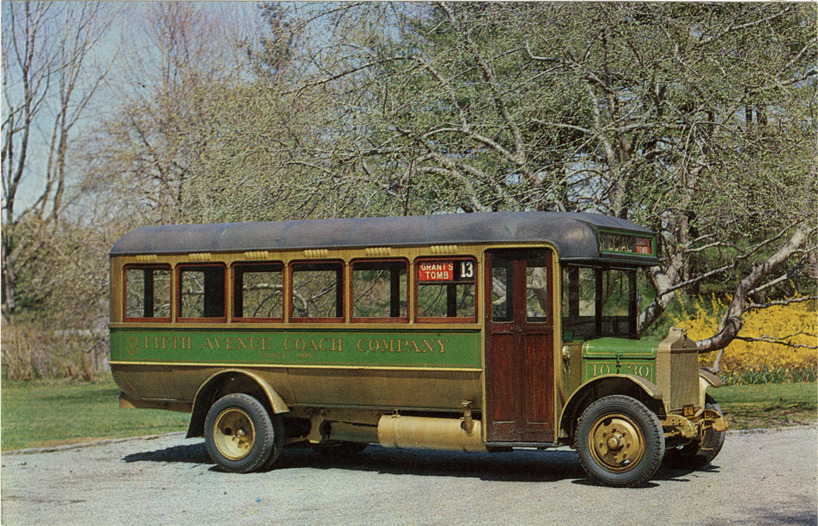 View of a 1925 Fifth Avenue Coach Company bus. Printed on back: "1925 Fifth Avenue 24 P. cross-town bus from the Henry Austin Clark, Jr. Collection of Antique Automobiles on display at the Long Island Auto Museum, Southampton, New York. The Museum is open from 9 to 5 daily, June thru Sept., week-ends in late May and October. Photo by Henry Austin Clark Jr. Dormand postcard, Riverhead, Long Island, N.Y."