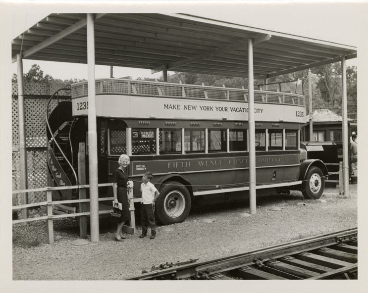 View of a woman and boy posing with a Fifth Avenue Coach Company double-decker bus. Handwritten on back: "Fifth Ave."