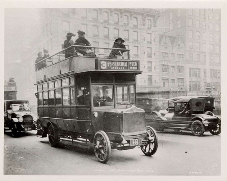 View of passengers on a 1915 Fifth Avenue Coach Company double-decker bus. Handwritten on back: "First All-American bus, 1915. Blt. by Fifth Ave. Coach Co."
