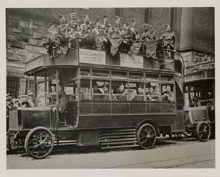 View of soldiers posing on a Fifth Avenue Coach Company double-decker bus during British Recruiting Week. Handwritten on back: "Fifth Ave., British Recruiting Week."