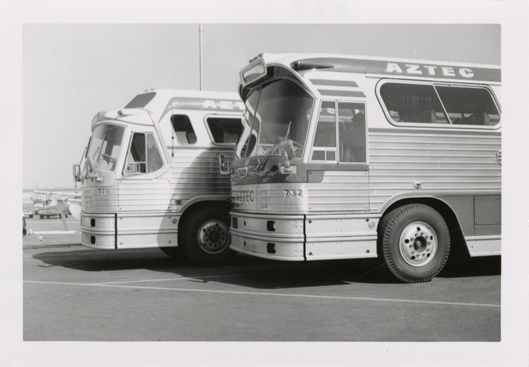 View of a 1964 Flxible bus and a 1962 Flxible bus, for the Aztec Bus Lines. Stamped on back: "Andrew R. Harrison, 10917 Choisser St., Whittier, Calif. Photo by: Date: Feb 23, 1964." Handwritten on back: "Flxible. 41 pass. Nice comparison. 1962 model (728). 1964 model (732)."