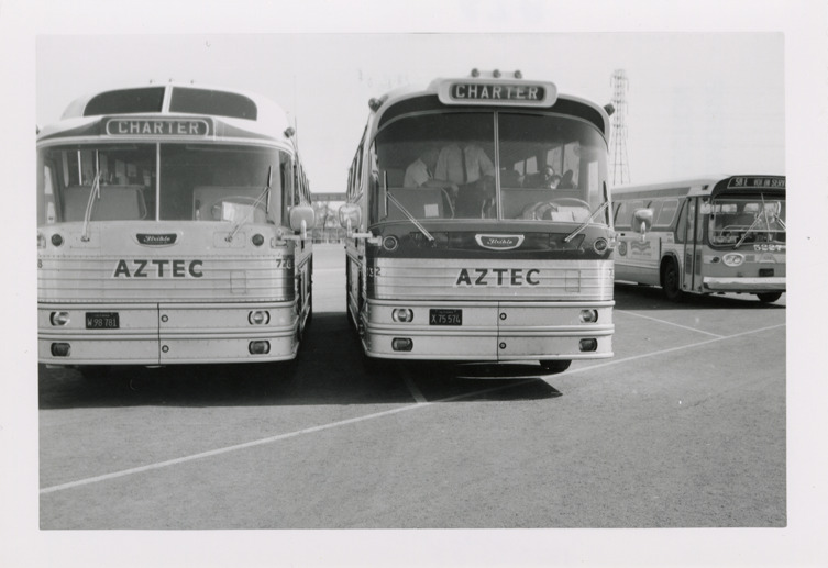 Favorite this☆ 1964 Flxible buses, Aztec Bus Lines Description: Front view of two 1964 Flxible buses, for the Aztec Bus Lines. Stamped on back: "Andrew R. Harrison, 10917 Choisser St., Whittier, Calif. Photo by: Date: Feb 23, 1964." Handwritten on back: "Flxible, 1964. 41 pass. Goofed again, with eye-finder." Details Resource ID: na048184 Creator: Harrison, Andrew R. Subject: Buses Flxible Company Photographers--California--Whittier Photographic prints Date Issued: 1964-02-23 Format: 1 photographic print ; 3.5 x 5 in. Member of: National Automotive History Collection Filing Location: MS121/VanDegrift, Thomas, 7:12 Rights: Physical rights are retained by DPL. Copyright is retained in accordance with U.S. copyright laws.