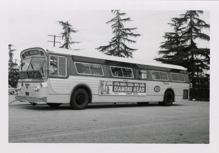 View of a Flxible bus for the Los Angeles Metropolitan Transit Authority. Stamped on back: "Andrew R. Harrison, motor coaches and motor coach transportation. 10917 Choisser St., Whittier, Calif." Typed on back: "New Flxible coach delivered to the LAMTA in Feb. 1963."