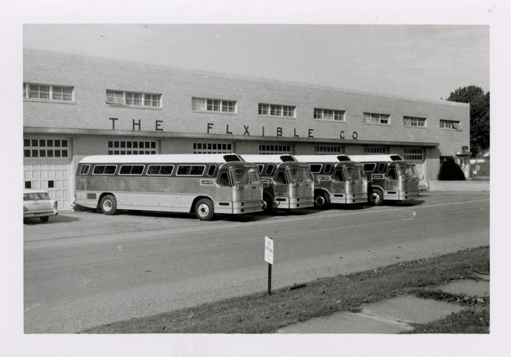 View of Flxible buses parked in front of the Flxible Company. Stamped on back: "Andrew R. Harrison, motor coaches and motor coach transportation. 10917 Choisser St., Whittier, Calif." Handwritten on back: "Flxible."