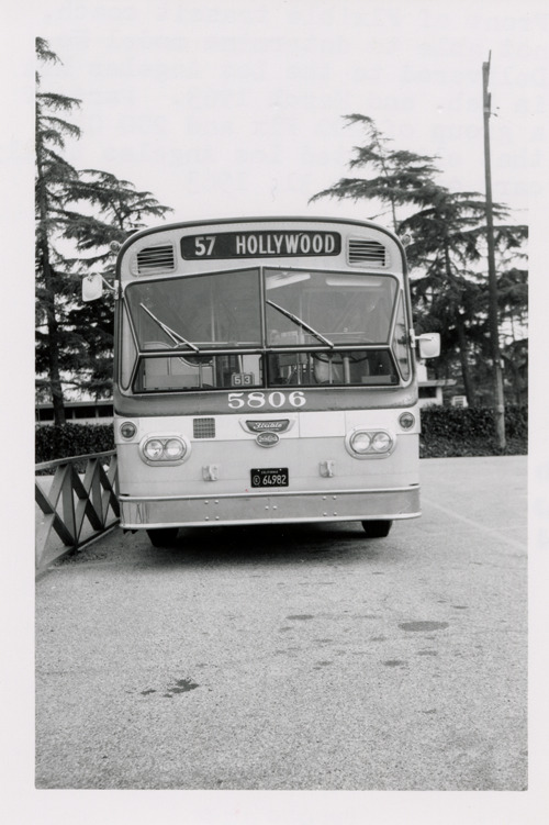 Front view of a Flxible bus for the Los Angeles Metropolitan Transit Authority. Stamped on back: "Andrew R. Harrison, motor coaches and motor coach transportation. 10917 Choisser St., Whittier, Calif." Typed on back: "Front of Flxible transit coach, not able to determine model no. Delivered to the Los Angeles MTA in Feb. and March 1963. Part of a group of 200 Flx and 200 GMC that eliminated Los Angeles trolly [sic] cars on March 31, 1963."