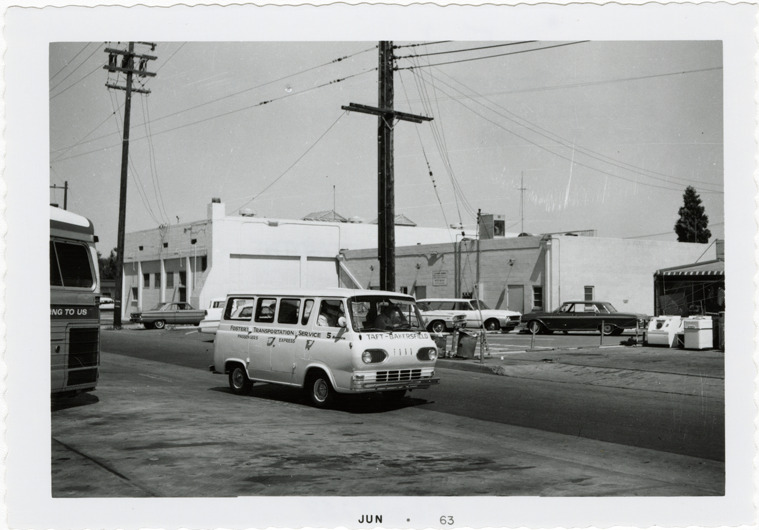 View of a Ford bus for the Foster Transportation Co. in Bakersfield, California. Printed on front: "Jun 63." Typed on back: "Foster Transportation Co. #5. Bakersfield, California. June 4, 1963."