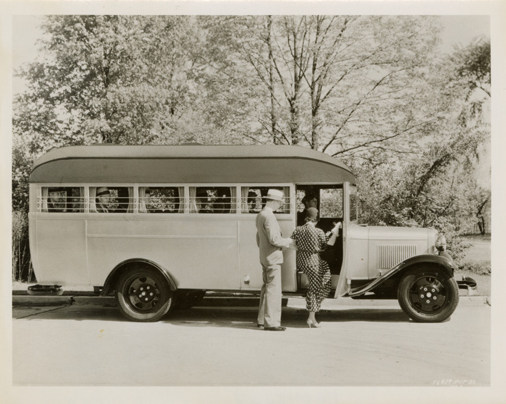 View of passengers boarding a Ford bus. Handwritten on back: "Ford, 17 May 1932."