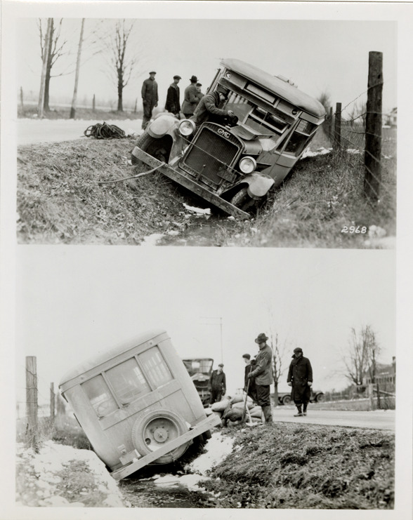 Two views of an experimental GMC bus in ditch at Pontiac, Michigan. Handwritten on back: "GMC experimental bus in ditch, Pontiac, MI, 1924."