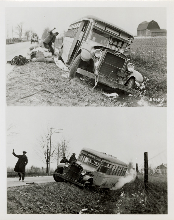 Favorite this☆ GMC experimental bus in ditch, Pontiac, Michigan Description: Two views of an experimental GMC bus in ditch at Pontiac, Michigan. Handwritten on back: "GMC experimental bus in ditch, Pontiac, MI, 1924." Details Resource ID: na048284 Subject: Buses--Michigan--Pontiac GMC Truck & Coach Traffic accidents--Michigan--Pontiac Photographic prints Date Issued: 1924 Format: 1 photographic print ; 5 x 4 in. Member of: National Automotive History Collection Filing Location: MS121/VanDegrift, Thomas, 8:4 Rights: Physical rights are retained by DPL. Copyright is retained in accordance with U.S. copyright laws.