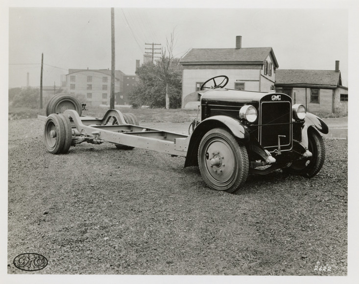 View of the chassis for a GMC bus. Handwritten on back: "GMC. Experimental bus chassis, 25 pass., X-30. 7-27-1923."