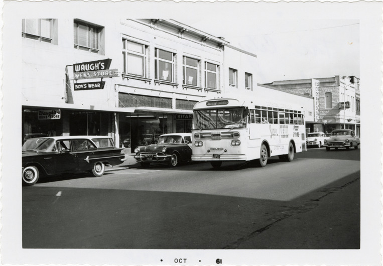 View of a GMC bus for Tri-City Transit, Aberdeen, Washington. Printed on front: "Oct 61." Handwritten on back: "Tri-City Transit #144. Aberdeen, Washington. Sept. 29, 1961. GMC chassis, body - Superior?"