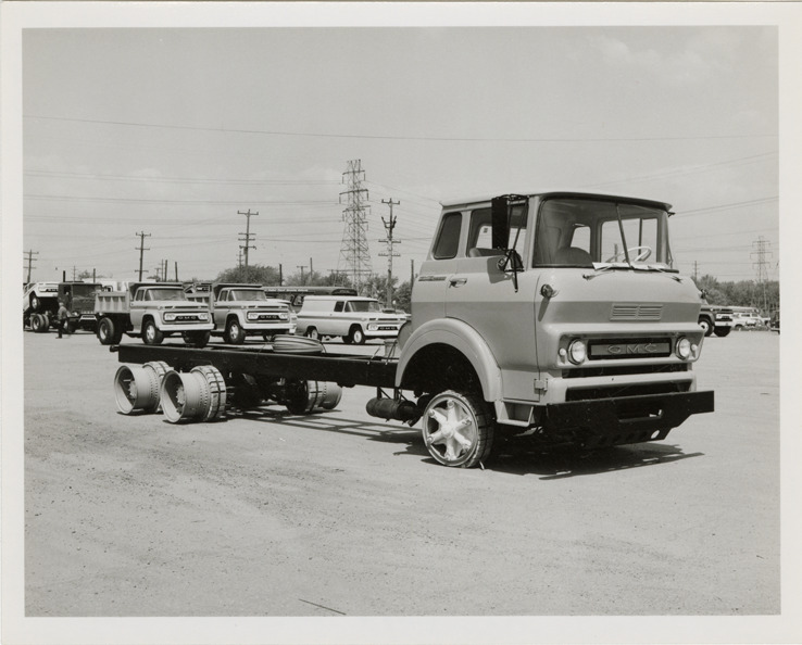 View of a GMC truck. Stamped on back: "May 25 1963." Handwritten on back: "GMC. W 7000."