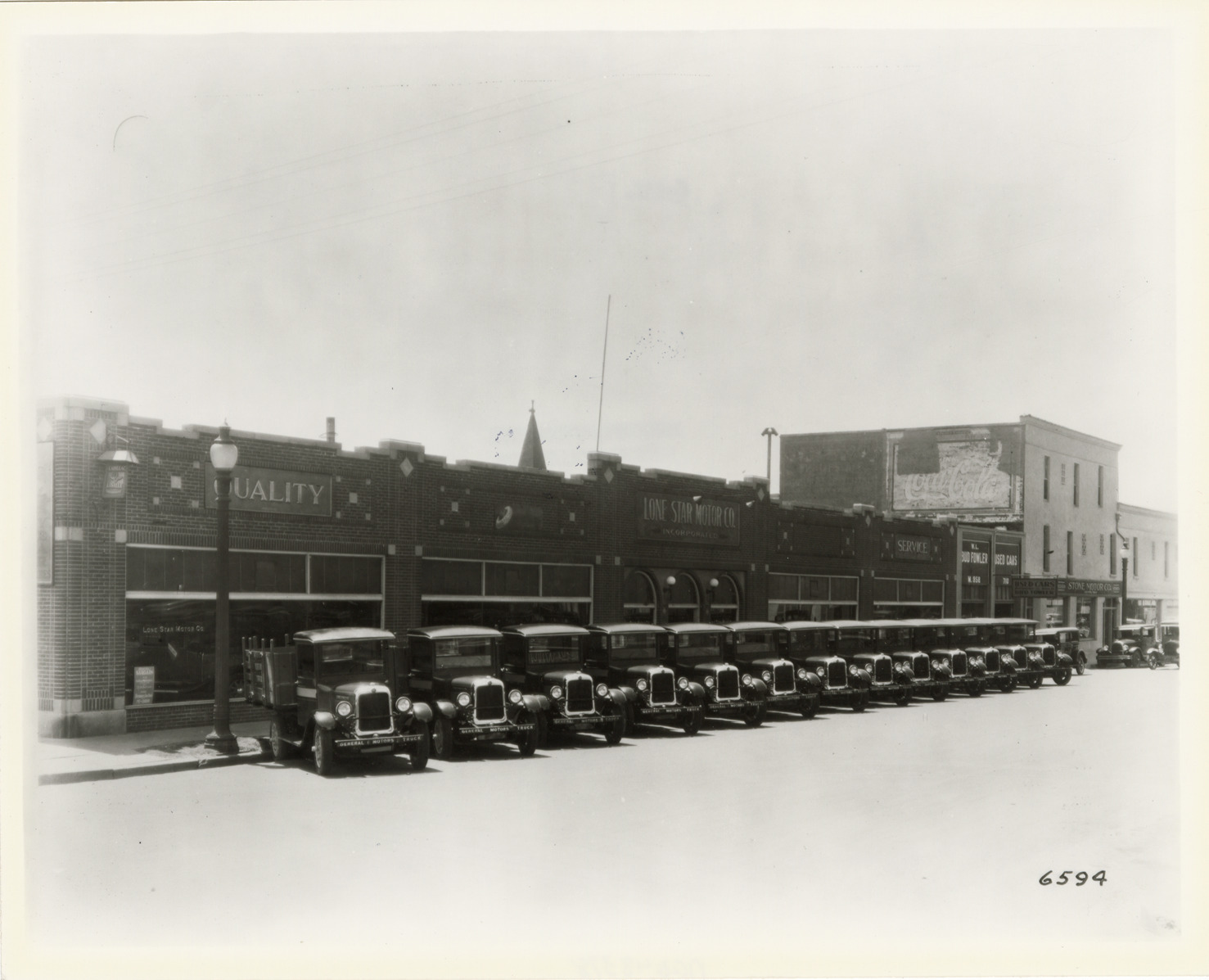 View of GMC trucks parked in front of Lone Star Motor Co. Handwritten on back: "GMC."