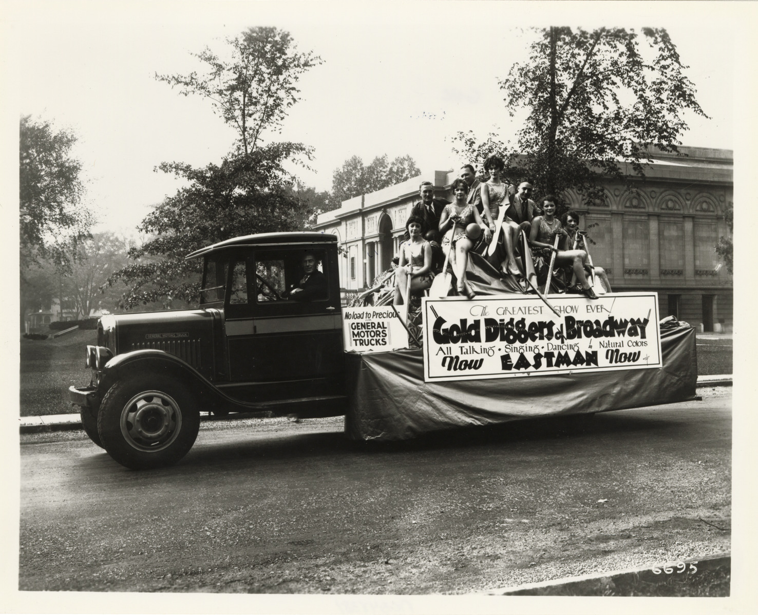 View of cast members from "Gold diggers of Broadway" posing on GMC truck. Signs on truck read: "No load too precious for General Motors trucks" and "The greatest show ever, Gold diggers of Broadway. All talking, singing, dancing in natural colors. Now Eastman now." Handwritten on back: "GMC."