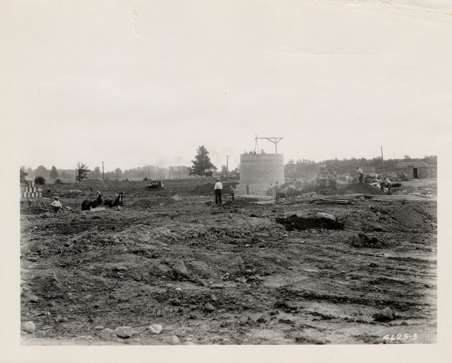 View of the power plant during construction at the site of the General Motors Truck Plant (also Yellow Truck and Coach Manufacturing Company) in Pontiac, Michigan. Label on back: "Placing footings and erecting stack on sight [sic] of the 110 x 140 power plant of the General Motors Truck Co., taken July 14, 1927." Handwritten on back: "Pontiac, MI."