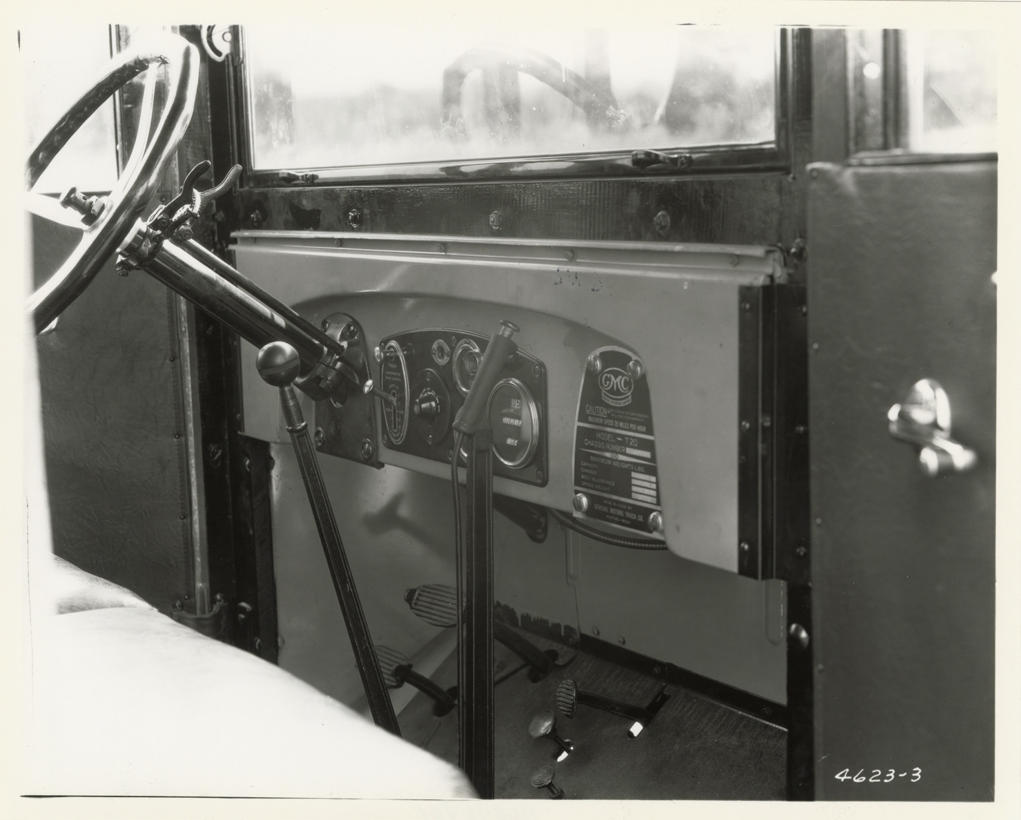 View of a the interior of a GMC truck, showing steering wheel and instrument panel. Handwritten on back: "GMC."