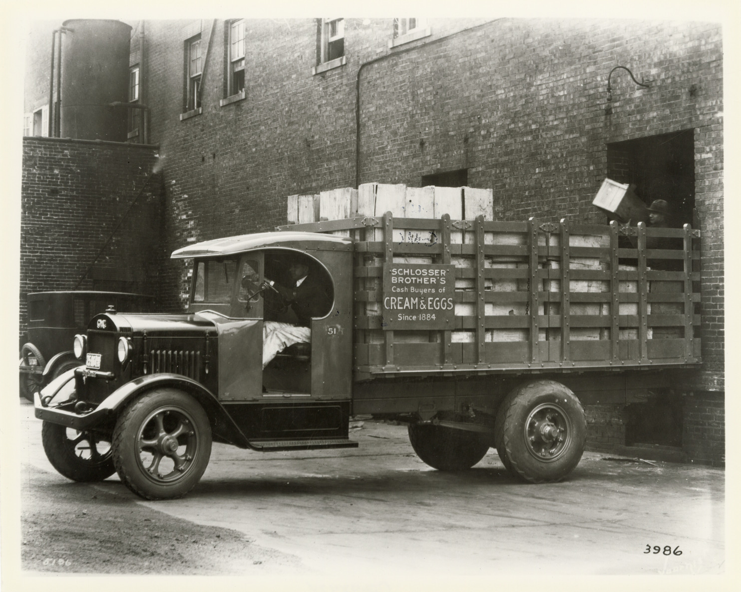 Favorite this☆ GMC truck, Schlosser Brothers Description: View of a driver posing in a GMC truck for Schlosser Brothers. Painted on truck: "Schlosser Brothers. Cash buyers of cream & eggs since 1884." Handwritten on back: "GMC." Details Resource ID: na048474 Subject: GMC trucks Photographic prints Date Issued: Unknown year Format: 1 photographic print ; 8 x 10 in. Member of: National Automotive History Collection Filing Location: MS121/VanDegrift, Thomas, 9:4 Rights: Physical rights are retained by DPL. Copyright is retained in accordance with U.S. copyright laws.