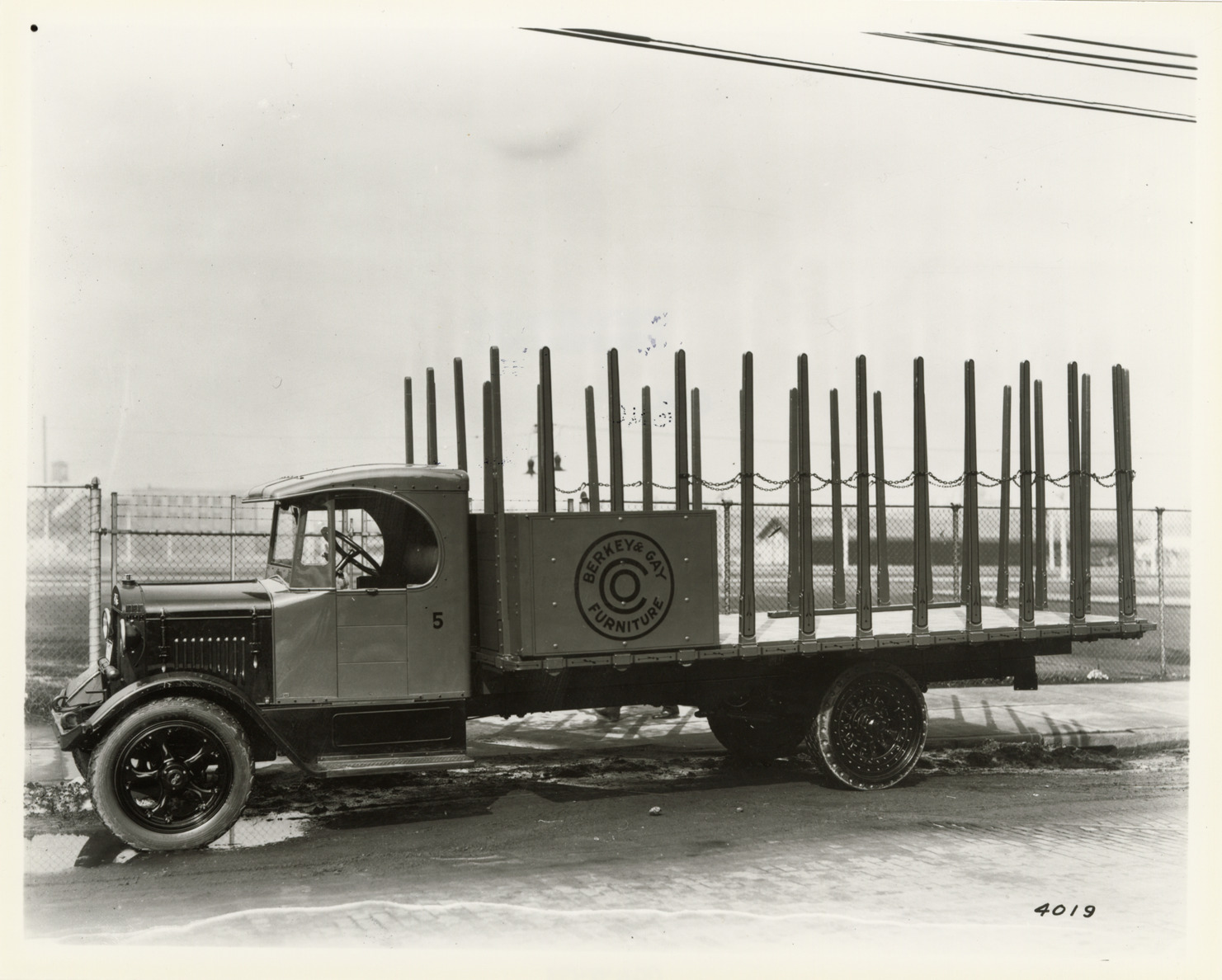 View of a GMC truck for Berkey & Gay Furniture. Painted on truck: "Berkey & Gay Furniture." Handwritten on back: "GMC."