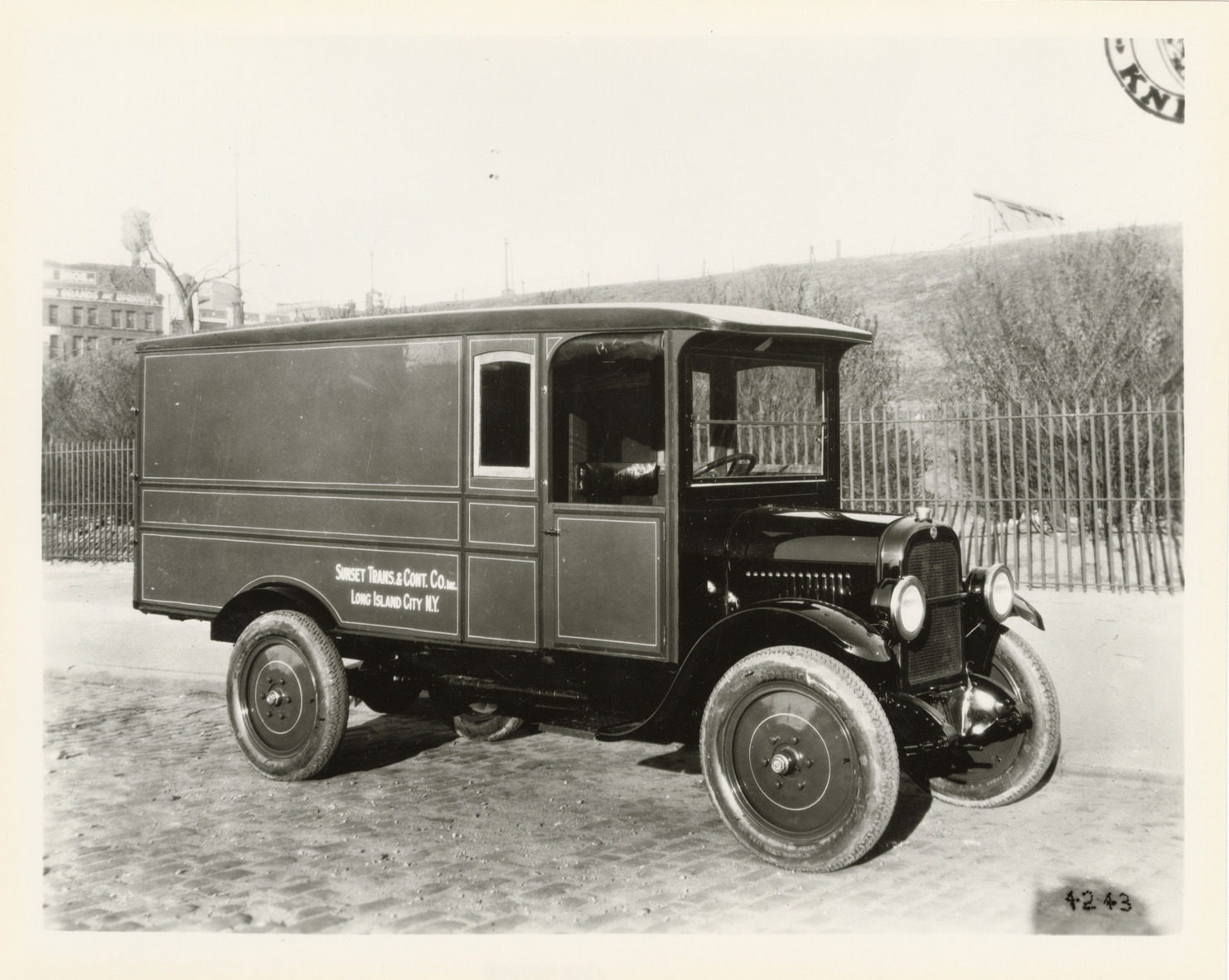 View of a GMC truck for the Sunset Trans. & Cont. Co. Painted on side of truck: "Sunset Trans. & Cont. Co., Long Island City, N.Y." Handwritten on back: "GMC."