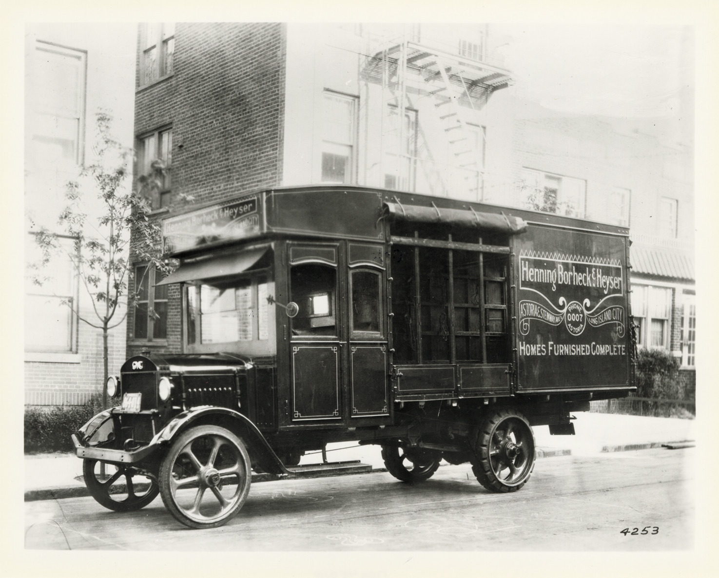 Favorite this☆ GMC truck, Henning, Borheck & Heyser Description: View of a GMC truck for Henning, Borheck & Heyser. Painted on side of truck: "Henning, Borheck & Heyser. Astoria & Steinway Ave., Long Island City, Phone 0007 Astoria. Homes furnished complete." Handwritten on back: "GMC." Details Resource ID: na048510 Subject: GMC trucks Photographic prints Date Issued: Unknown year Format: 1 photographic print ; 8 x 10 in. Member of: National Automotive History Collection Filing Location: MS121/VanDegrift, Thomas, 9:6 Rights: Physical rights are retained by DPL. Copyright is retained in accordance with U.S. copyright laws.