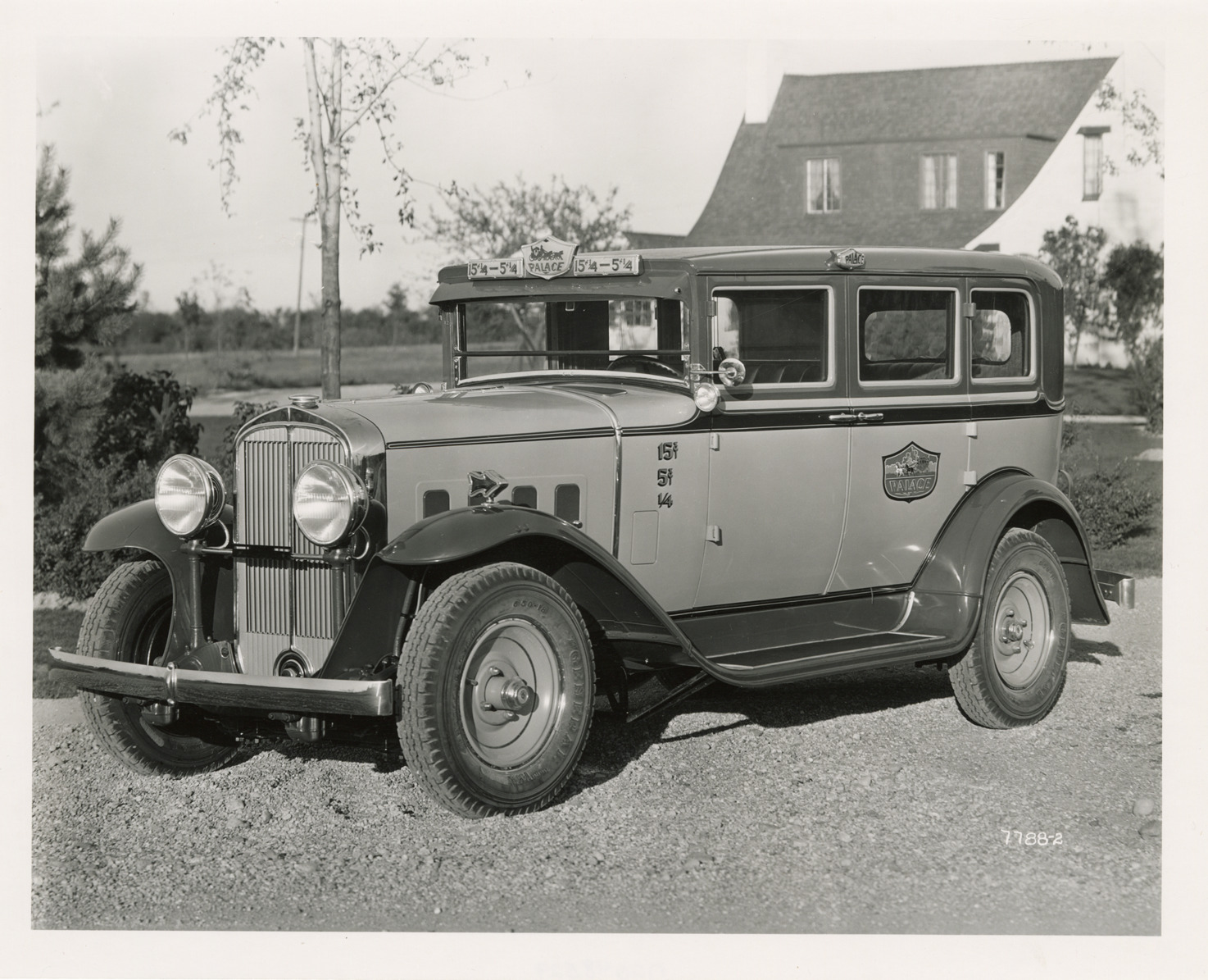 View of a 1931 Yellow Truck and Coach taxi for the Palace Transportation Co. Painted on taxi: "Palace, 15 [cents]." Handwritten on back: "GM truck. General cab Model 0-12 chassis for Palace Holding Corp. 10-31."