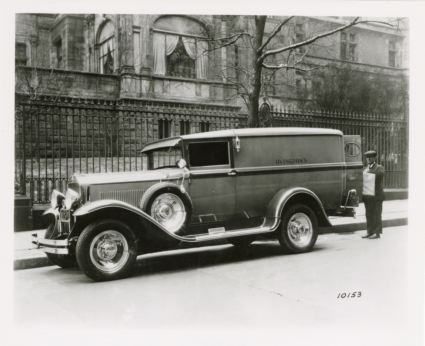 View of a man unloading a 1931 GMC truck for Ovington's. Handwritten on back: "GM truck Model 0-10."