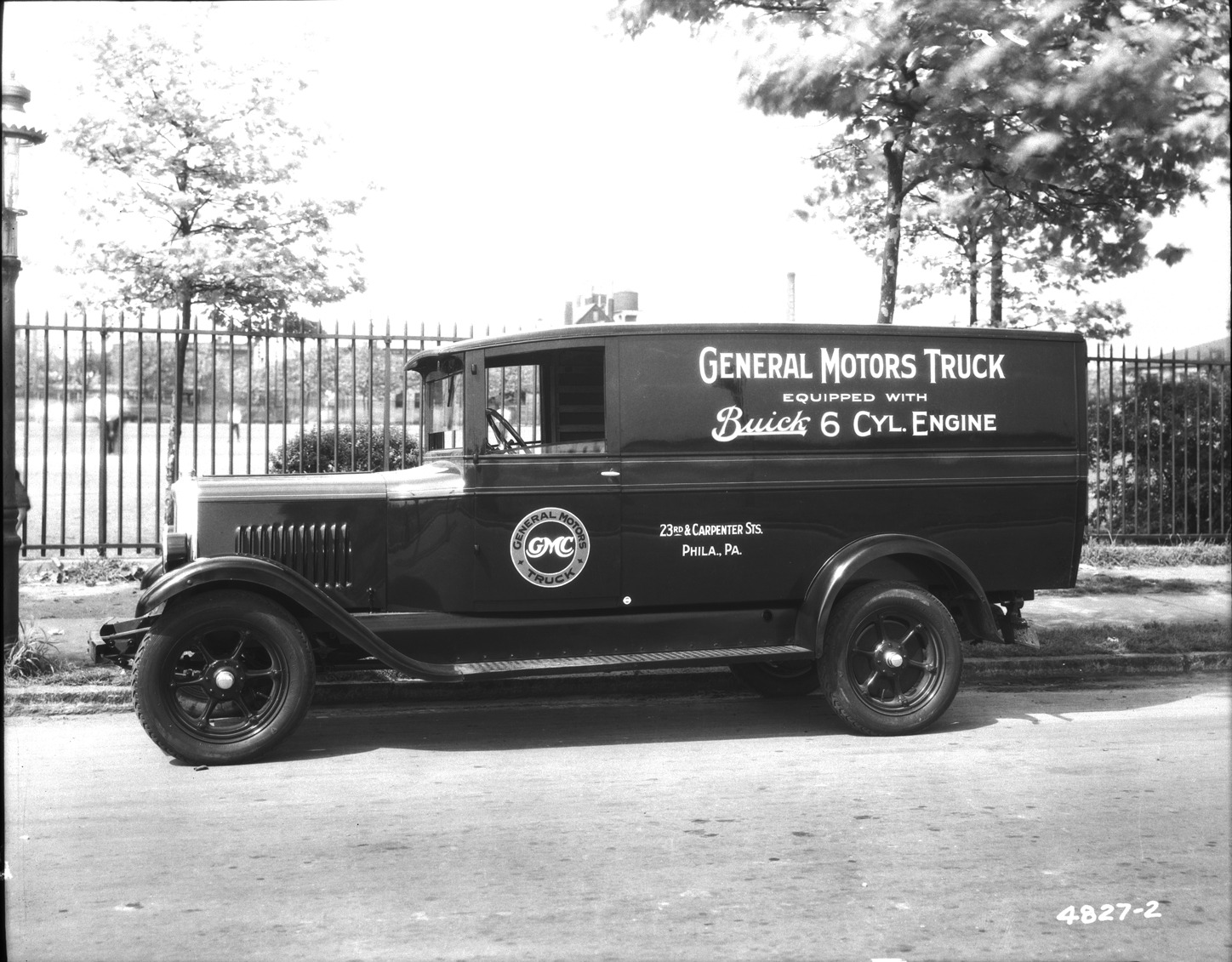 View of a GMC truck for the General Motors Truck Company. Painted on truck: "General Motors Truck equipped with Buick 6 cyl. motor. 23rd & Carpenter Sts., Phila., Pa." Handwritten on sleeve: "GMC, General Motors Truck equipped with Buick 6 cylinder motor, 23rd & Carpenter Sts., Philadelphia, PA."