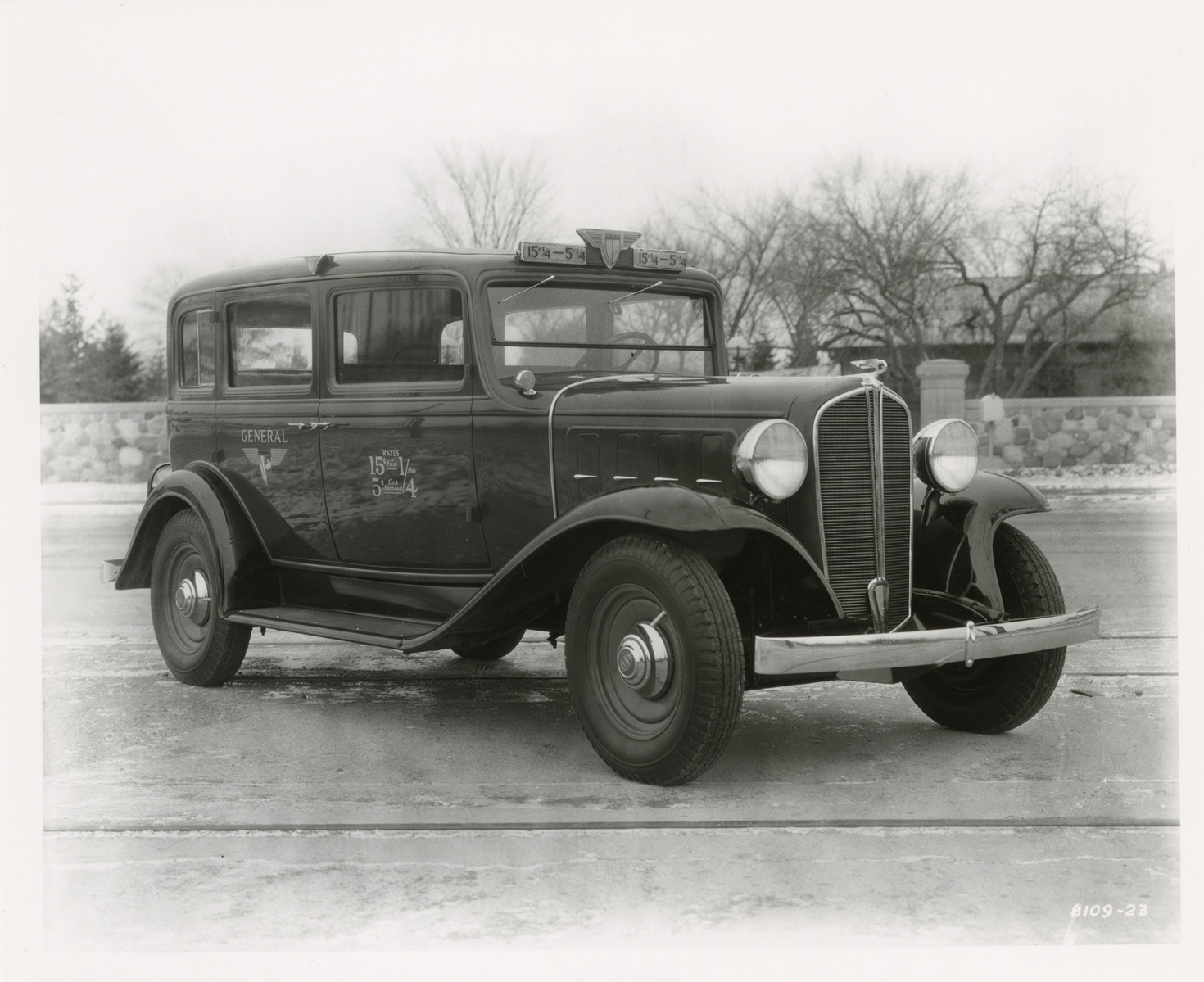 View of a 1932 Yellow Truck and Coach taxi General taxi. Handwritten on back: "GM truck. Model 0-14. 12-32."