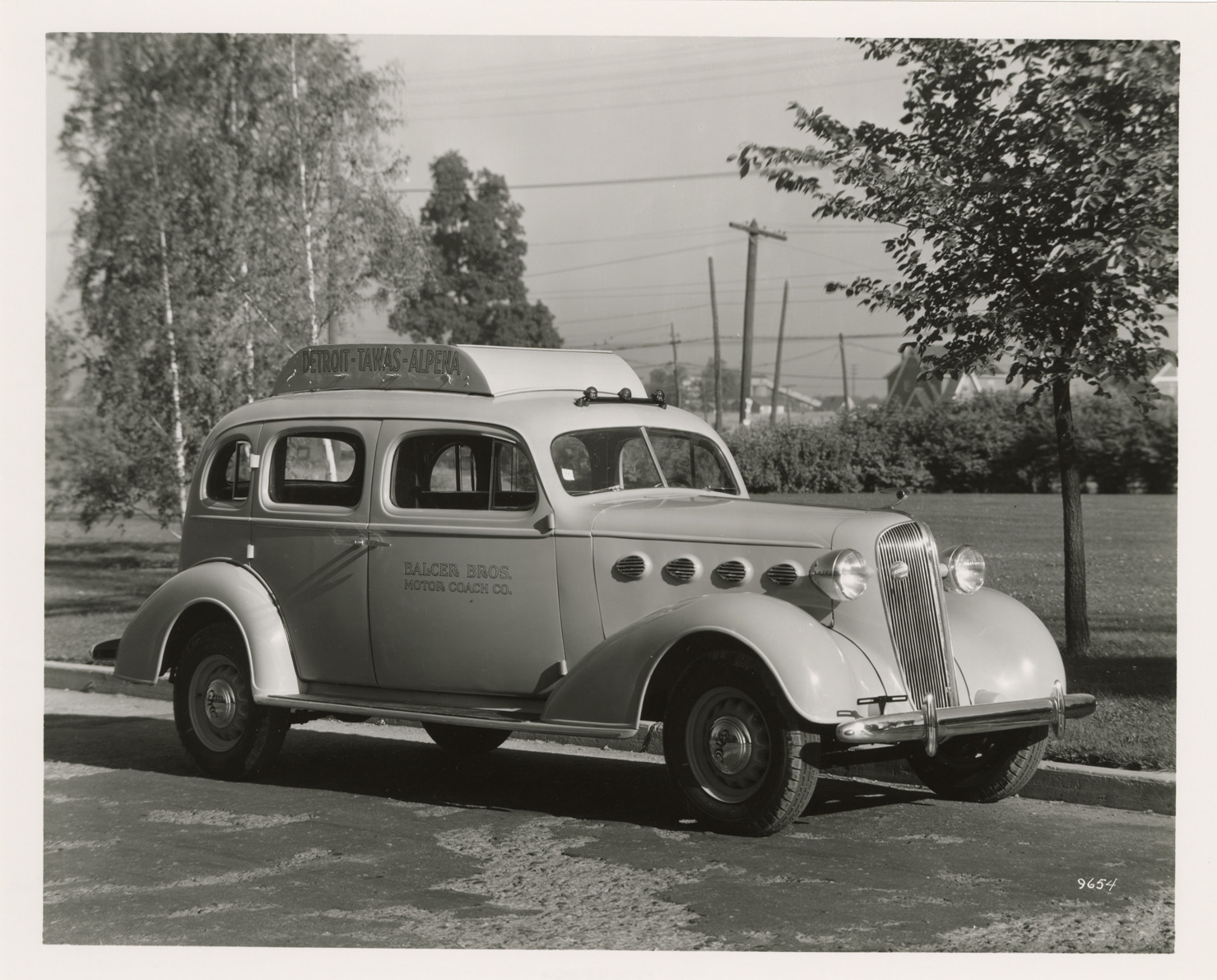 View of a 1936 Yellow Truck and Coach taxi for the Balcer Bros. Motor Coach Co. Handwritten on back: "0-16. Balcer Bros., Bay City, Mich. 7-31-36."
