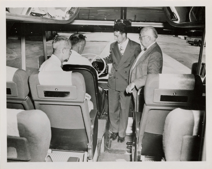 Favorite this☆ Driver and men in 1949 experimental Greyhound GX-2 bus Description: View of driver and three men in a 1949 experimental Greyhound GX-2 bus. Handwritten on back: "Greyhound experimental GX-2, 1949." Details Resource ID: na048606 Subject: Greyhound buses Buses--Interiors Buses--Seats Bus drivers Photographic prints Date Issued: Unknown year Format: 1 photographic print ; 4 x 5 in. Member of: National Automotive History Collection Filing Location: MS121/VanDegrift, Thomas, 11:8 Rights: Physical rights are retained by DPL. Copyright is retained in accordance with U.S. copyright laws.