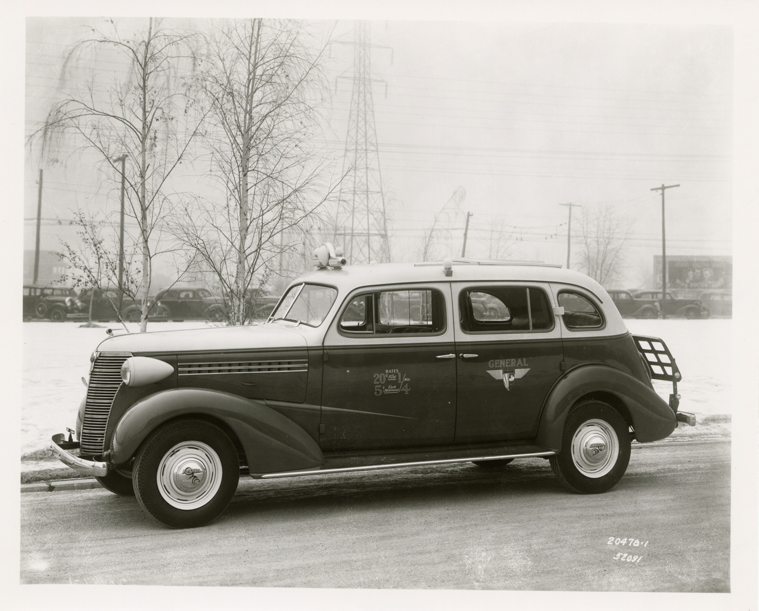 View of a 1937 Yellow Truck and Coach General taxi. Handwritten on back: "0-18. 12-37."