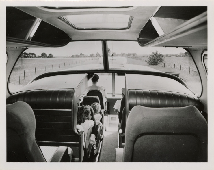 Favorite this☆ Interior, 1949 experimental Greyhound GX-2 bus Description: View of interior of a 1949 experimental Greyhound GX-2 bus, showing driver and passengers. Handwritten on back: "Greyhound experimental GX-2, 1949." Details Resource ID: na048615 Subject: Greyhound buses Buses--Interiors Buses--Seats Bus drivers Photographic prints Date Issued: Unknown year Format: 1 photographic print ; 4 x 5 in. Member of: National Automotive History Collection Filing Location: MS121/VanDegrift, Thomas, 11:8 Rights: Physical rights are retained by DPL. Copyright is retained in accordance with U.S. copyright laws.