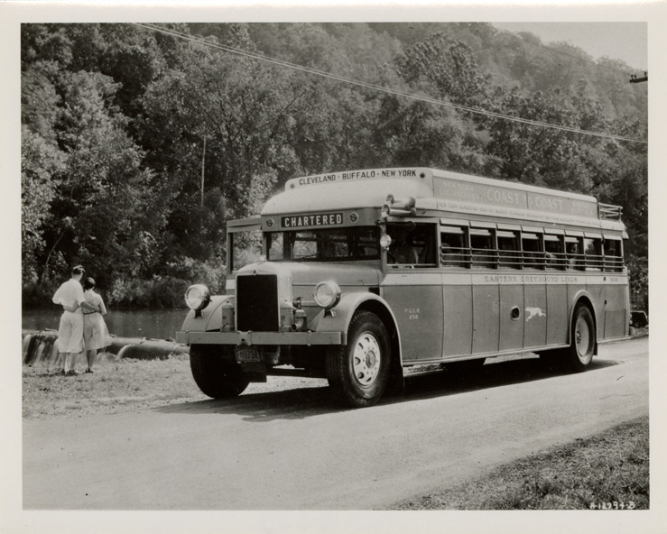 View of a Greyhound bus. "Eastern Greyhound Lines" is painted on side of bus; passengers on roadside. Handwritten on back: "Eastern Greyhound publicity photo."
