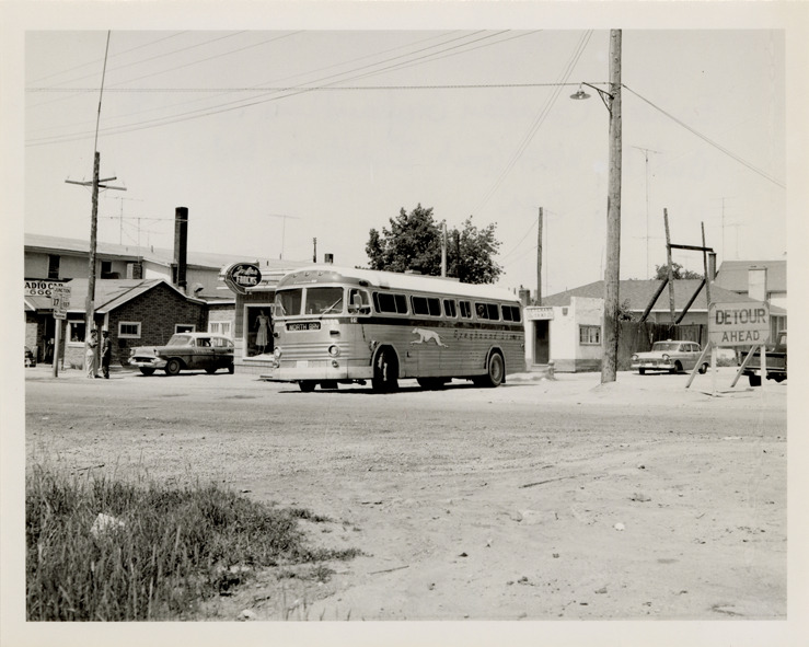 View of a Greyhound bus at Blind River, Ontario. Stamped on back: "Jul 1958." Handwritten on back: "Eastern Canadian Greyhound Lines Courier 96. Built by Motor Coach Industries, Ltd. Winnipeg, CAN. 41 pass., GM 671 Diesel. Blind River, Ont."